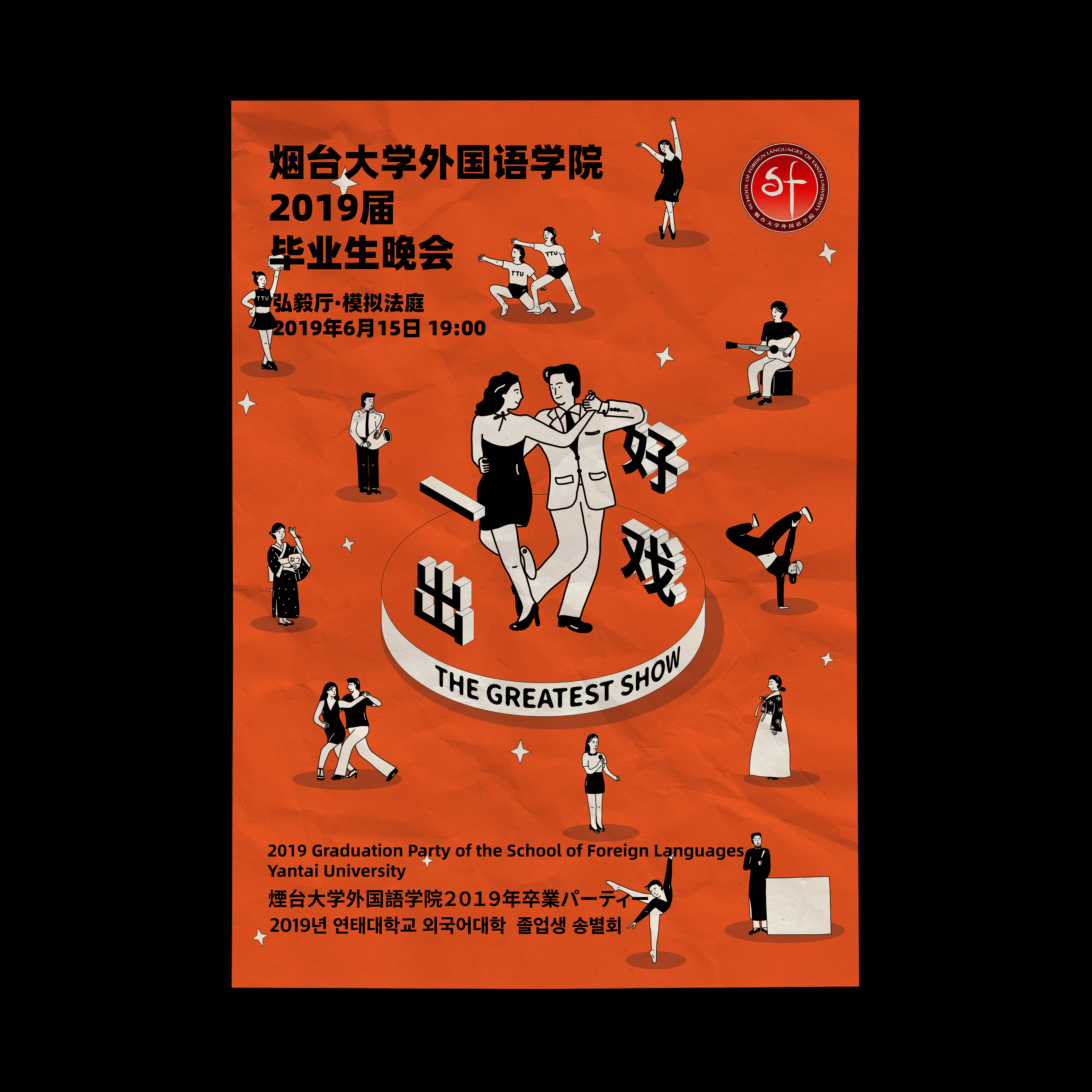This is the key vision design for the 2019 Graduation Party of the School of Foreign Languages, Yantai University, including the logo, posters and tickets.